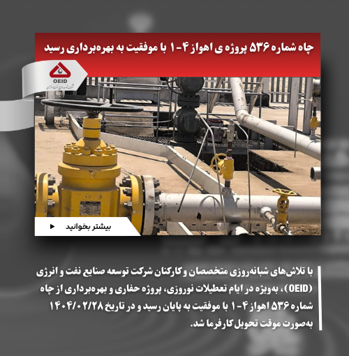 📌با تلاشهای شبانهروزی متخصصان و کارکنان شرکت توسعه صنایع نفت و انرژی (OEID)، بهویژه در ایام تعطیلات نوروزی، پروژه حفاری و بهرهبرداری از چاه شماره ۵۳۶ اهواز ۴-۱ با موفقیت به پایان رسید و در تاریخ ۱۴۰۴/۰۲/۲۸ بهصورت موقت تحویل کارفرما شد.