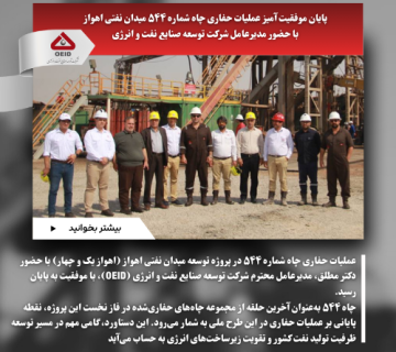 پایان موفقیتآمیز عملیات حفاری چاه شماره ۵۴۴ میدان نفتی اهواز با حضور مدیرعامل شرکت توسعه صنایع نفت و انرژیZahra Tohidiآگوست 26, 2025📌عملیات حفاری چاه شماره ۵۴۴ در پروژه توسعه میدان نفتی اهواز (اهواز یک و چهار) با حضور دکتر مطلق، مدیرعامل محترم شرکت ... ادامه مطلب