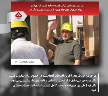 بازدید مدیرعامل شرکت توسعه صنایع نفت و انرژی از روند استقرار دکل حفاری ۲۰۸ در میدان نفتی یادآورانZahra Tohidiآگوست 26, 2025📌دکتر مطلق، مدیرعامل محترم شرکت توسعه صنایع نفت و انرژی (OEID)، از روند استقرار دکل حفاری شماره ۲۰۸ در میدان نفتی یادآوران ... ادامه مطلب