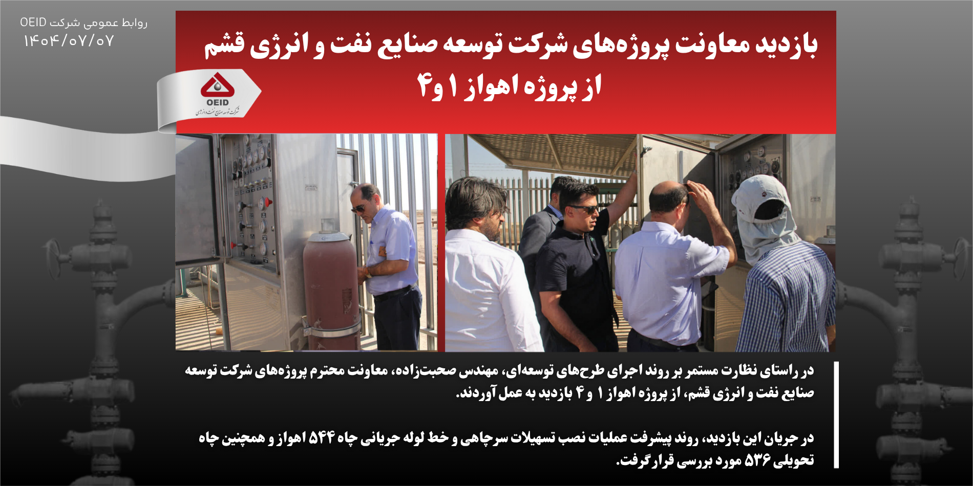 در جریان این بازدید، روند پیشرفت عملیات نصب تسهیلات سرچاهی و خط لوله جریانی چاه ۵۴۴ اهواز و همچنین چاه تحویلی ۵۳۶ مورد بررسی قرار گرفت.
