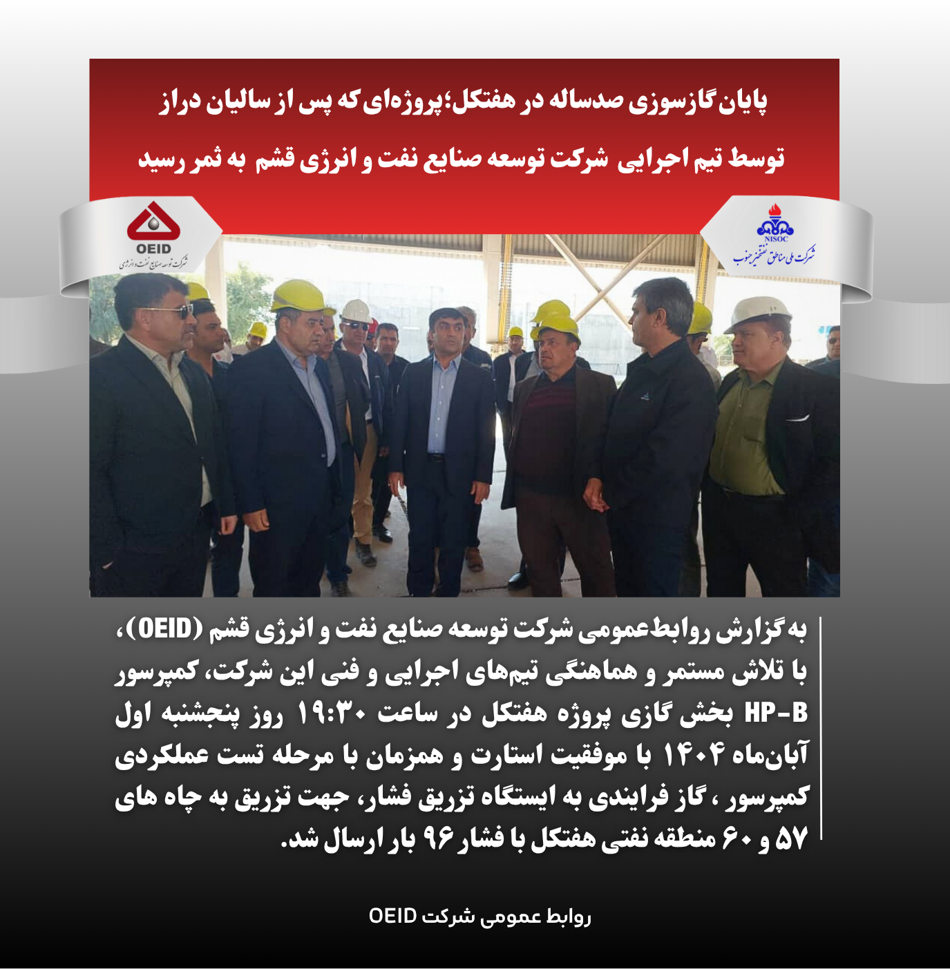 به گزارش روابطعمومی شرکت توسعه صنایع نفت و انرژی قشم (OEID)، با تلاش مستمر و هماهنگی تیمهای اجرایی و فنی این شرکت، کمپرسور HP-B بخش گازی پروژه هفتکل در ساعت ۱۹:۳۰ روز پنجشنبه اول آبانماه ۱۴۰۴ با موفقیت استارت و همزمان با مرحله تست عملکردی کمپرسور ، گاز فرایندی به ایستگاه تزریق فشار، جهت تزریق به چاه های 57 و 60 منطقه نفتی هفتکل با فشار 96 بار ارسال شد.