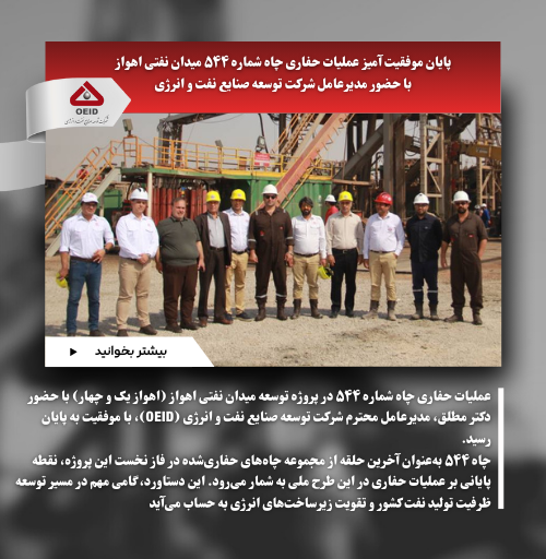 📌عملیات حفاری چاه شماره ۵۴۴ در پروژه توسعه میدان نفتی اهواز (اهواز یک و چهار) با حضور دکتر مطلق، مدیرعامل محترم شرکت توسعه صنایع نفت و انرژی (OEID)، با موفقیت به پایان رسید.